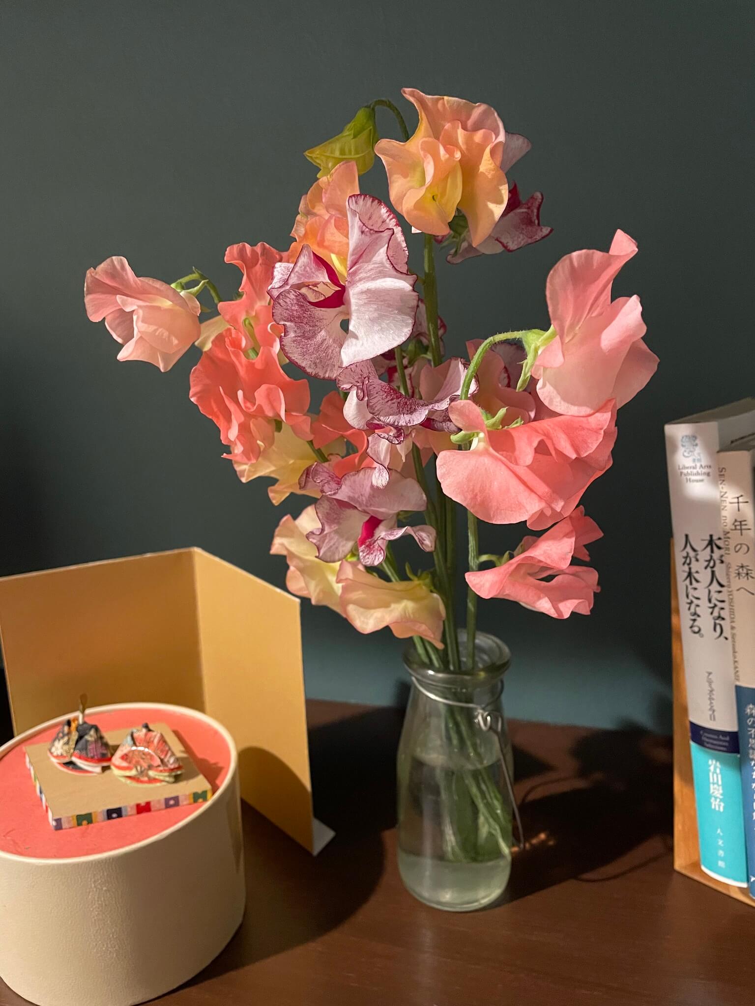 花すけさんに作ってもらったスイトピーの花束。来週は桃を飾ろう。